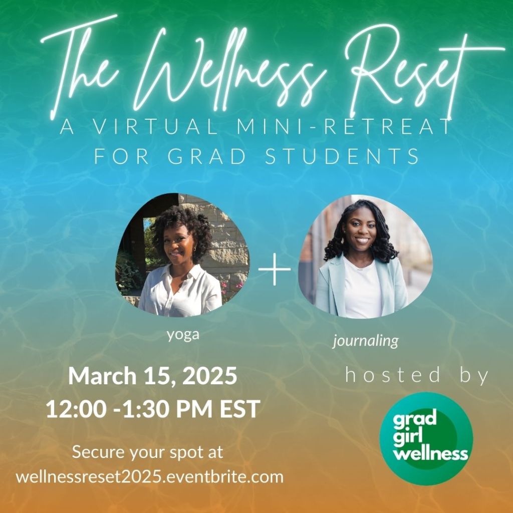 Grad school got you feeling overwhelmed? 😓 It’s time for a Wellness Reset! 🌿 Join us for a virtual wellness retreat dedicated to helping you recharge, refocus, and reconnect with your well-being.