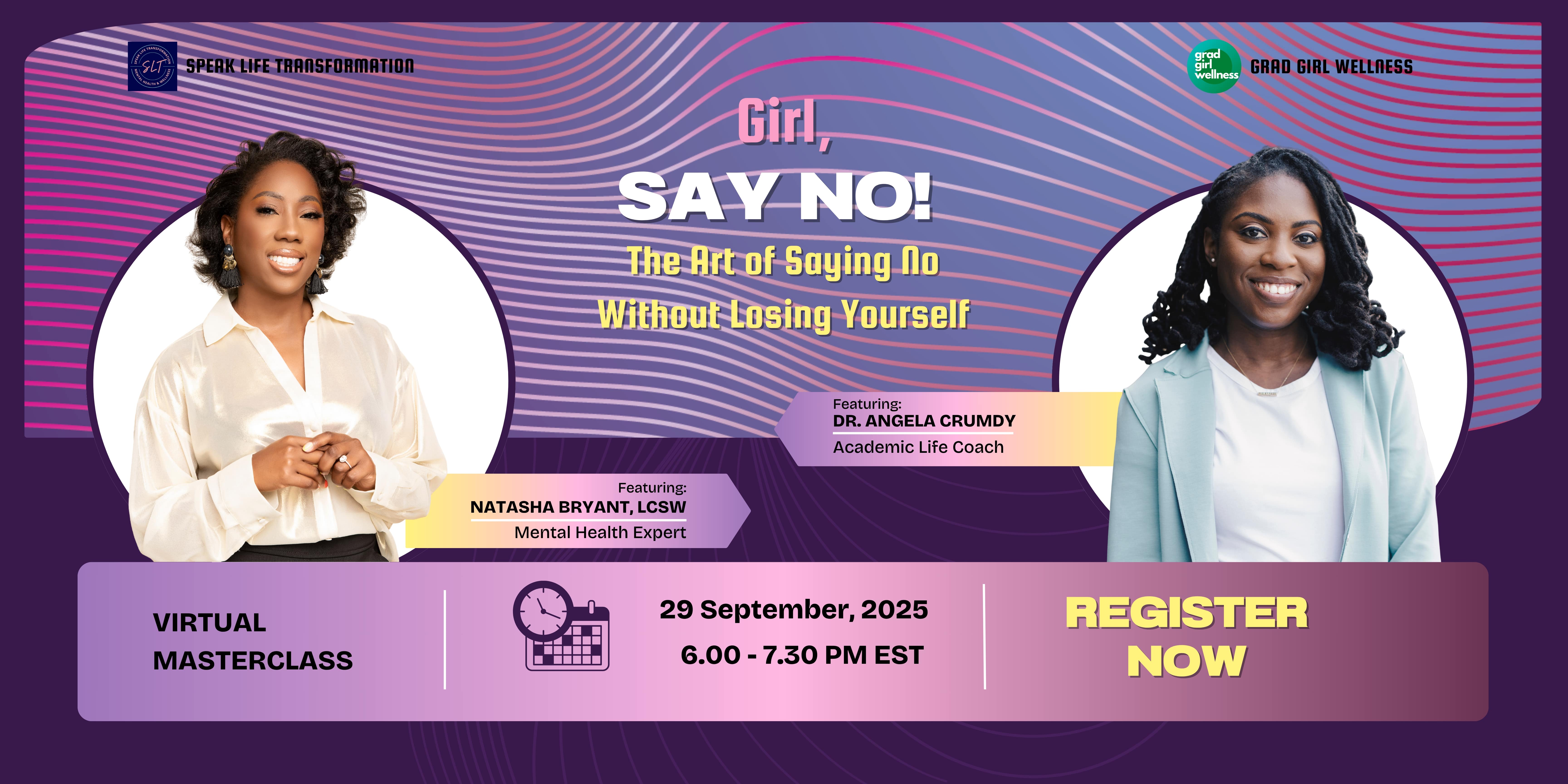 Join licensed mental health professional and confidence mindset coach, Natasha Bryant, LCSW (Speak Life Transformation), along with Dr. Angela Crumdy (Grad Girl Wellness), academic life coach and founder of Grad Girl Wellness, for a powerful 90-minute experience designed to help you stop overcommitting, break free from guilt, and start showing up for yourself—unapologetically.